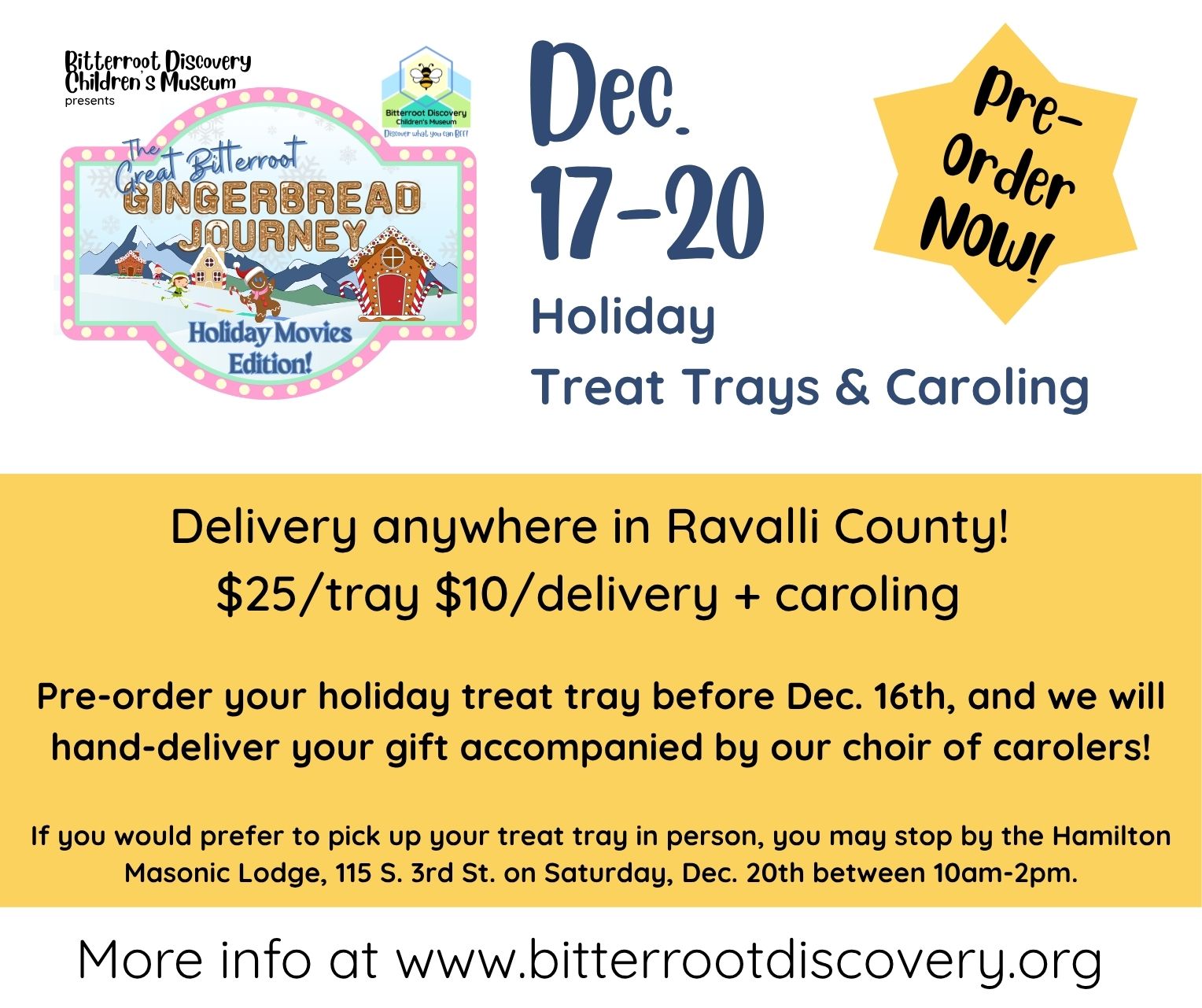Hamilton Masonic Lodge 115 S. 3rd St., Hamilton, United StatesWant to make the season bright for a friend or loved one on your list? Pre-order your holiday treat tray before Dec. 16th, and we will hand-deliver your gift accompanied by our choir of carolers! If you would prefer to pick up your treat tray in person, you may stop by the Hamilton Masonic Lodge,...